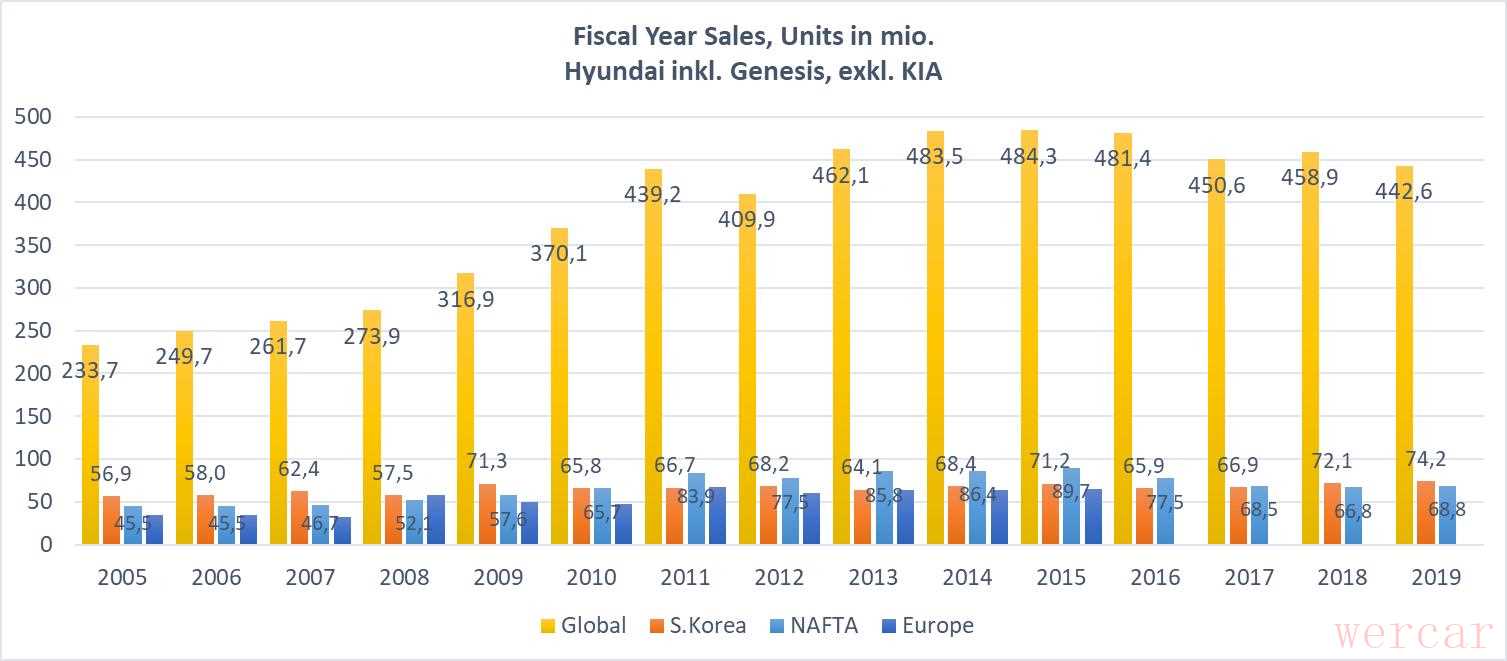 经济危机中几乎毫发未损的现代汽车,趁人之虚又搭上了经济复苏的快车,迎来5年发展黄金期。北美市场销量从2005年的46万台增长至2016年的77万台,市场占有率从2.7%增长至5.0%附近,要知道现代是一家没有Light Duty Trucks的厂家。同期,现代集团的全球销量从2005年的250万台增长至2016年的481万台,十年间销量从前十到前五,跨越了一众主流汽车品牌。