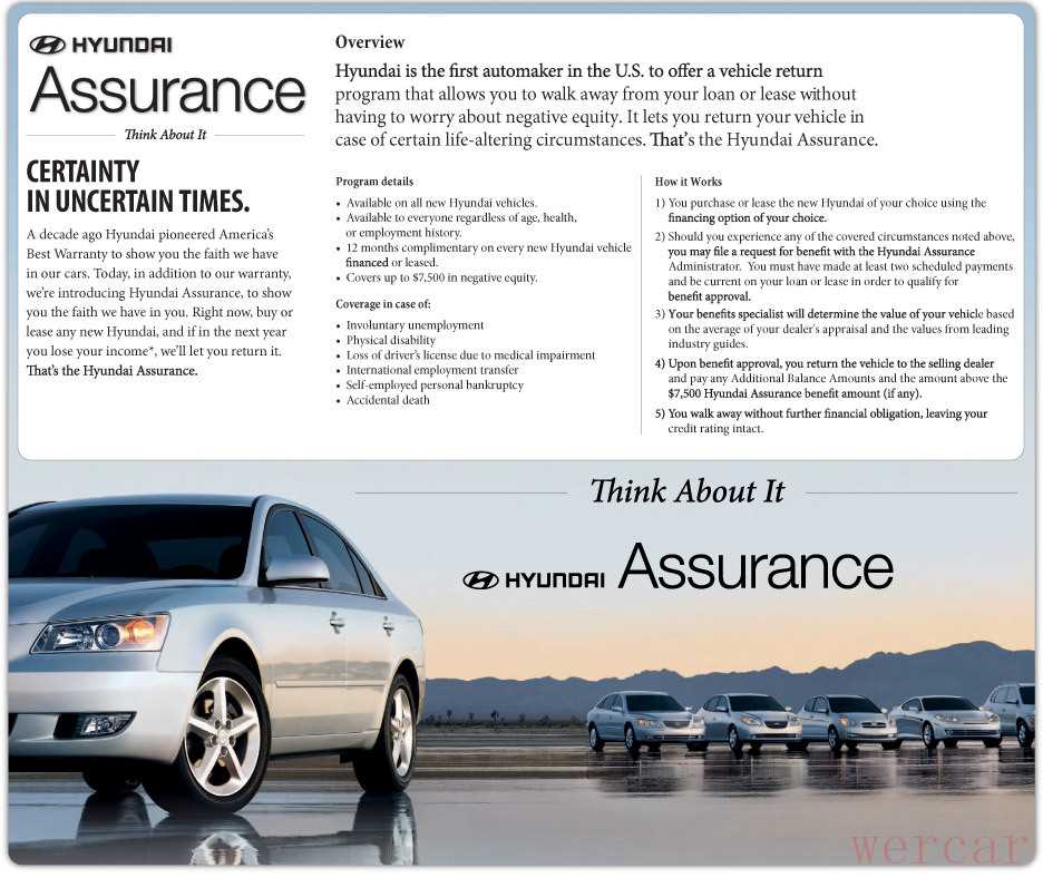 “Hyundai Assurance Program”,“现代保证计划”。内容大约是如果一位顾客在购买新车后一年内破产,这位顾客可以将车还给现代并得到部分购车款,类似于带有厂商回购权的租赁模式。其实这种模式早已存在,Ewanick只是做了营销包装,看似现代成本很大,背后实际是现代汽车金融产品做支撑,风险有限。这种营销方式很好地照顾了购车者对于经济下行的畏惧心理,最终只有不到100位顾客采用这一手段,却换来了现代北美2009年美国市场占有率增加了1.2%,而当年通用汽车的数据为-4.0%。