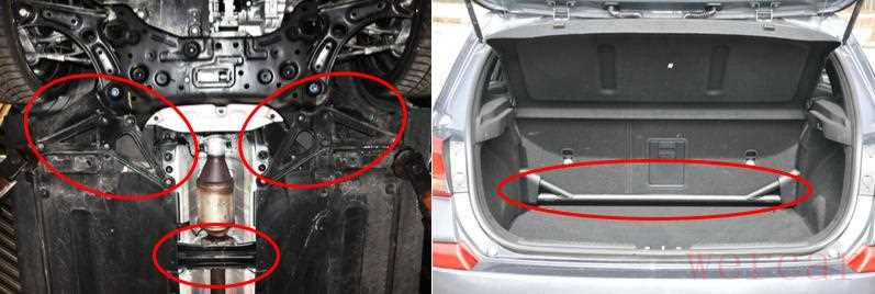 i30N并没有做出太多的车身强化,可见的增强结构包括前副车架延伸的支架结构、前消声器后方的传动轴凸台连接件以及后备箱中有一个连接两侧轮拱的支架,前者用于提升前轴在横向以及纵向上的刚度,后两者用于提升扭转刚度。不可见区域的增强结构则包括前轴减震器塔顶连接件以及后备箱盖周边、车身覆盖件拼接处的额外焊接点。