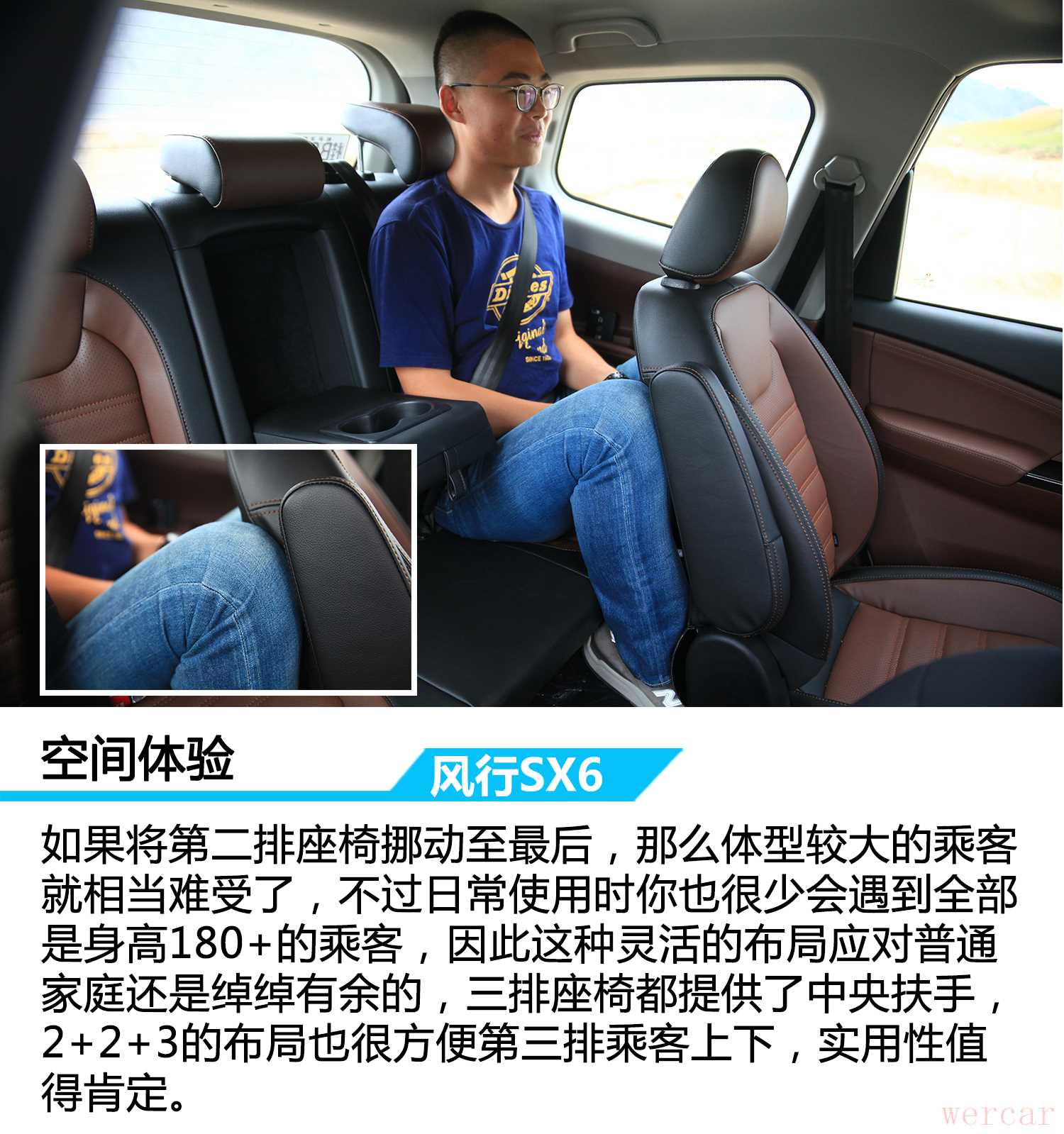 通过这次试驾,风行SX6的优势令人印象深刻,2750mm的轴距加上合理的七座布局,让这款车拥有足够诱人的竞争力,2+2+3的布局是最符合二孩家庭的布局,对于二三排的舒适度照顾也很出色,当然如果储物空间表现再出色一些会更加完美。另外,该车内外设计同样是可圈可点,动力方面基本够用,变速箱则是一大惊喜。总体来说,对于一款八万元左右的家用SUV来说,风行SX6的实力是足够优秀的,并且后期的1.5T发动机以及相应的内饰升级会进一步弥补目前的欠缺之处,实现对同级市场的冲击。