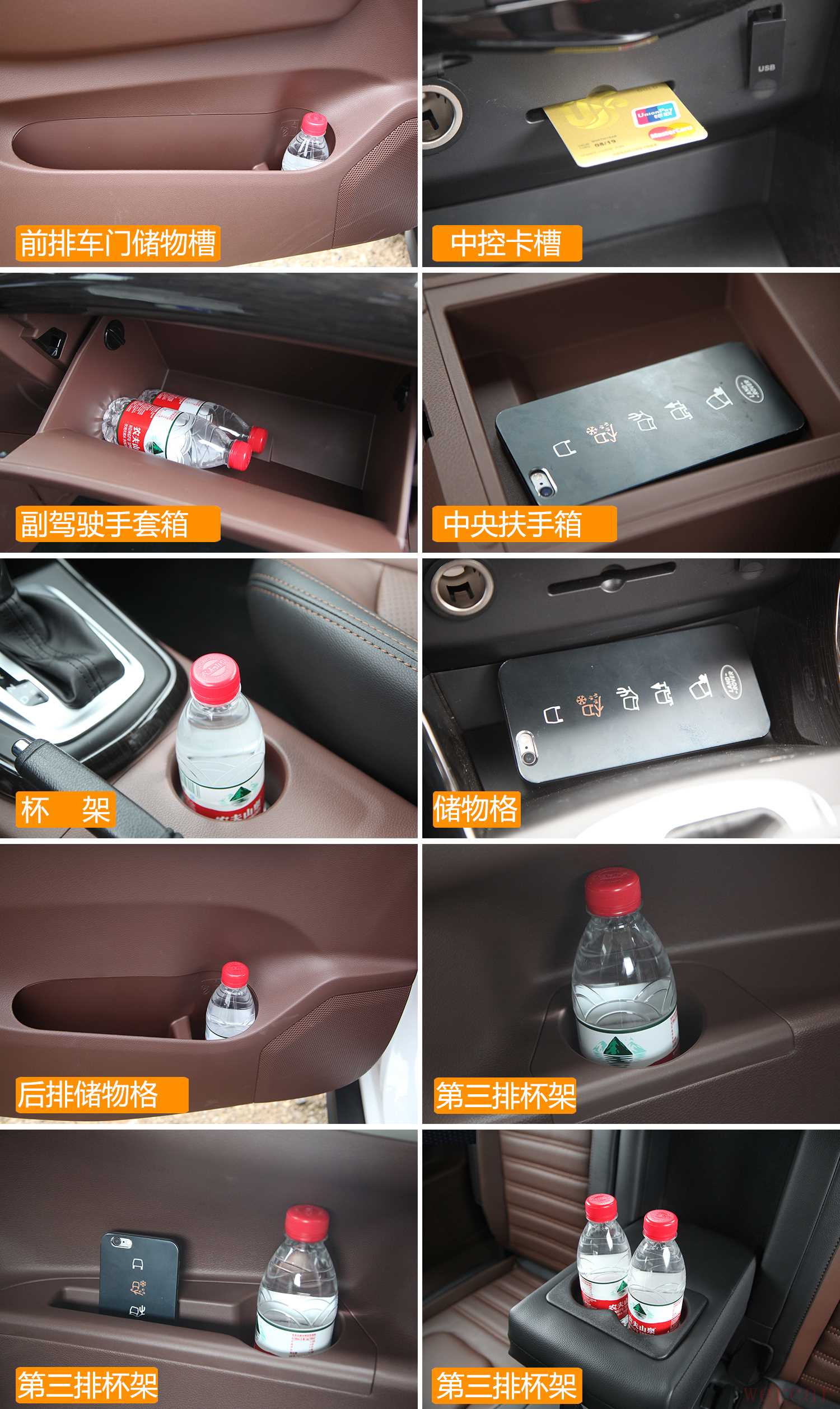在储物空间方面,风行SX6的前排空间表现一般,主要体验在前排杯架及前排的中央扶手箱,为了设计第二排的空调通风,因此牺牲了中央扶手箱的容积,仅能放置两部手机;第二排的空间主要为门板内的储物格,而第三排储物空间则比较出色,一共有四个杯架及一个小储物槽。