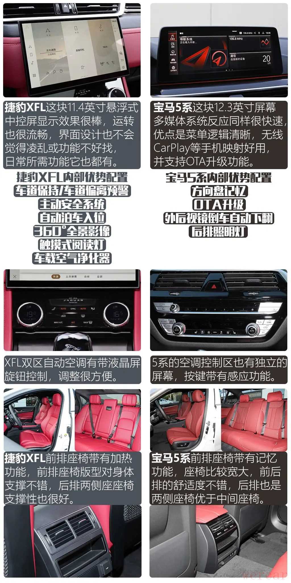 配置上同价位中配的捷豹XFL要比入门的5系高不少,像是车道保持、自动泊车、全景影像以及空气净化器这些它都是标配,在宝马5系上只有很少数的配置优势,舒适和辅助部分都是捷豹XFL的强项,但比较遗憾的是两台车都没有标配自适应巡航功能。多媒体系统两台车的屏幕清晰度都很高,XFL的主题更清新,5系的优势是支持OTA升级功能。