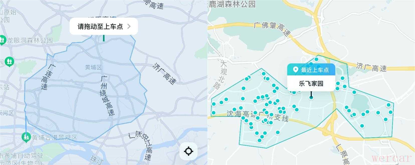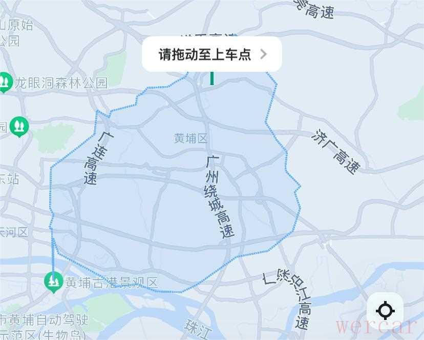 萝卜快跑在广州的试运营区域主要为广州黄埔区,同时也覆盖了天河区的部分区域。因此,当我们打开萝卜快跑App时,只能在地图显示的蓝色区域内呼叫车辆。乍一看,区域范围貌似还挺大的,但许多区域压根没法选定乘车点,边缘区域尤为明显。用户只能在地图提供的固定乘车点之间进行选择,自由度远不如网约车。
