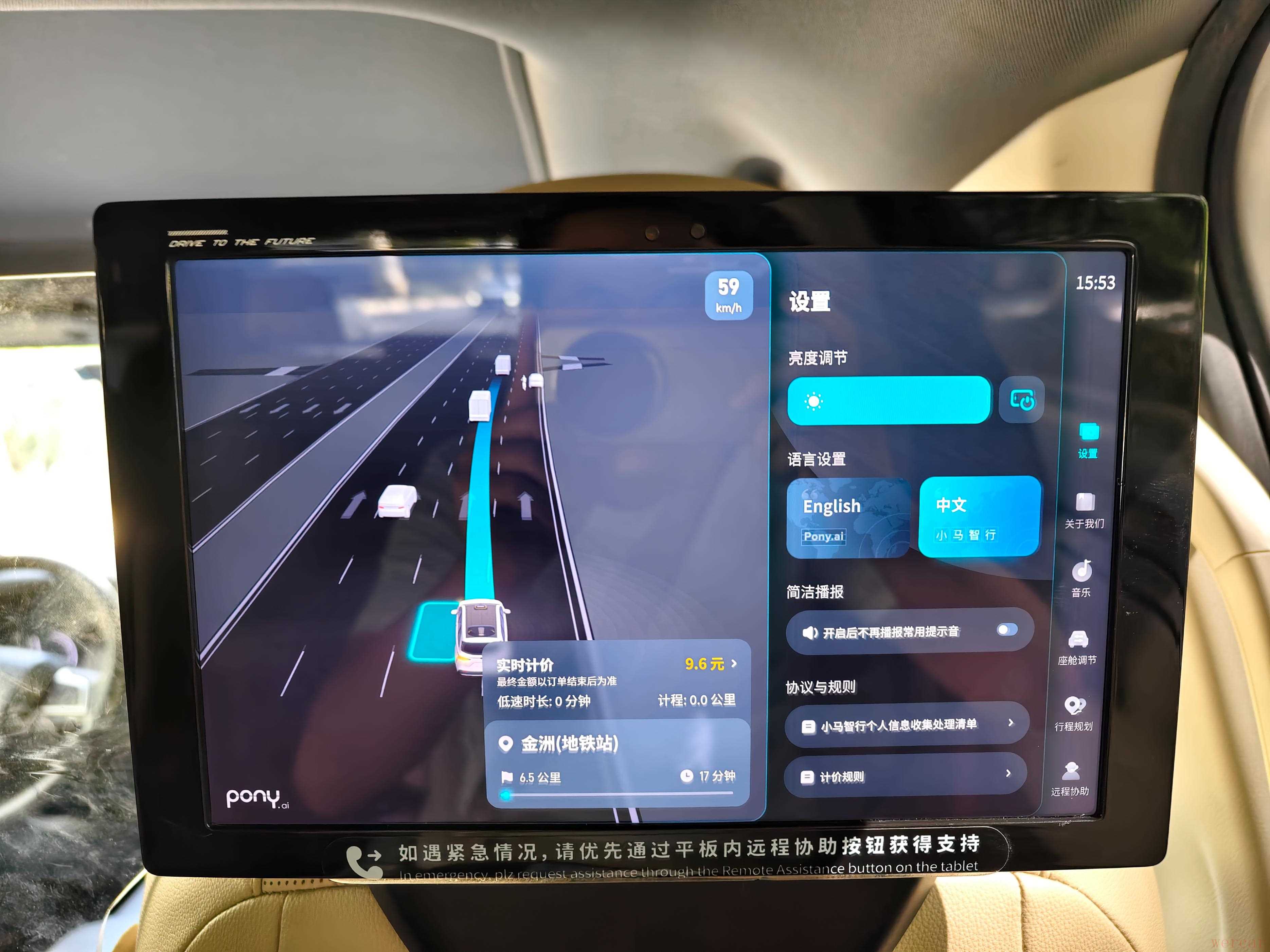 图源:小马智行车辆靠边停好后,乘客需要用App扫车门上的二维码确认身份,然后长按门把手上的按钮打开车门。上车后,全程由车内语音提醒乘客下一步操作,比如关闭车门、系好安全带、确认手机尾号等。中排两个显示面板提供音乐、视频、座舱调节、灯光、行程规划、远程协助等功能,操作流畅度十分不错。在车厢内还配有操作手册以及安全乘车须知等资料。