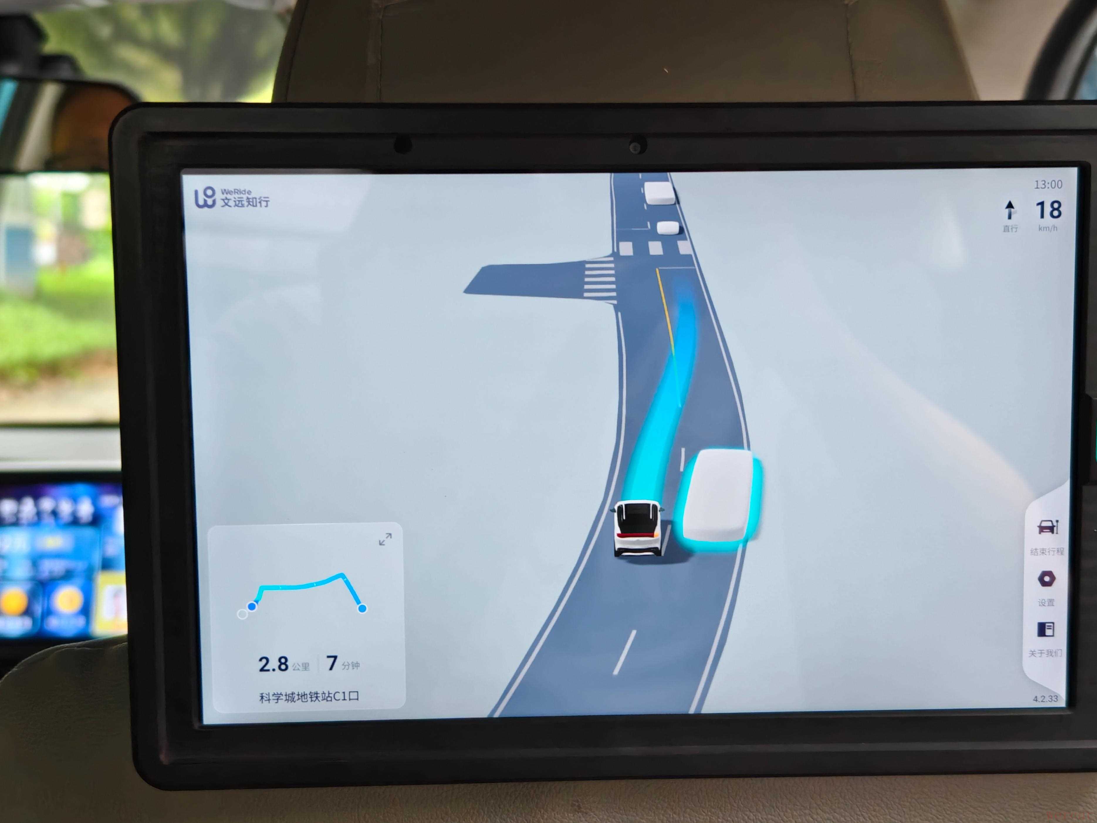 图源:雷科技摄制单论乘坐体验,文远知行和萝卜快跑其实没有太大差异。一方面,两者都在黄埔区行驶,交通环境是一样的。另一方面,两者的驾驶逻辑也很相近,就连最高时速默契保持在40km左右。但如果要加上智能感,小雷认为文远知行要稍微逊色于萝卜快跑。举个简单的例子,萝卜快跑好歹手机尾号是通过显示面板确认的,而文远知行只是安全员口头确认,更别提车辆交互功能的稀少了。