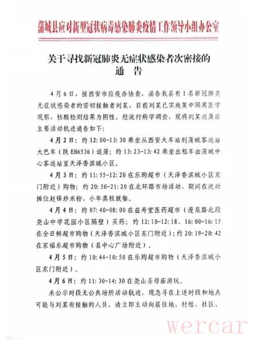 4月7日晚,蒲城县应对新型冠状病毒感染肺炎疫情工作领导小组办公室发布通告,在当地急寻新冠肺炎无症状感染者次密接人员。