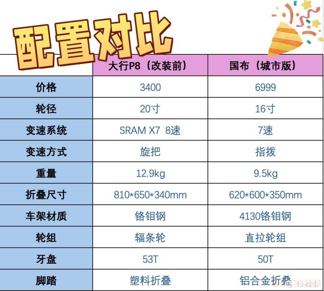 我们今天的主角还是两款折叠自行车,国布城市版和大行P8,先放一个表格,可以看出两款有什么不同之处。