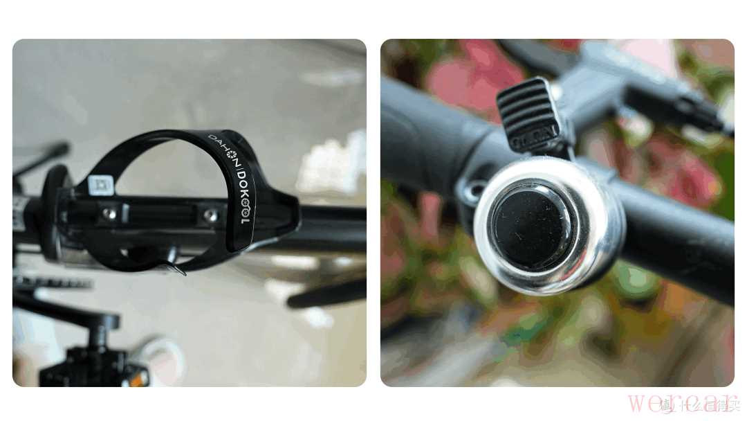 一些小配件:水壶架,我选择的是大行的一款,安装牢固,也能兼顾折叠,实惠又好用。P8的车架比较平,水壶最好选骑行水壶能卡在里边的,我一直用保温杯,滑出去好几回。还装了个小铃铛,在菜市场穿梭的时候,很实用。