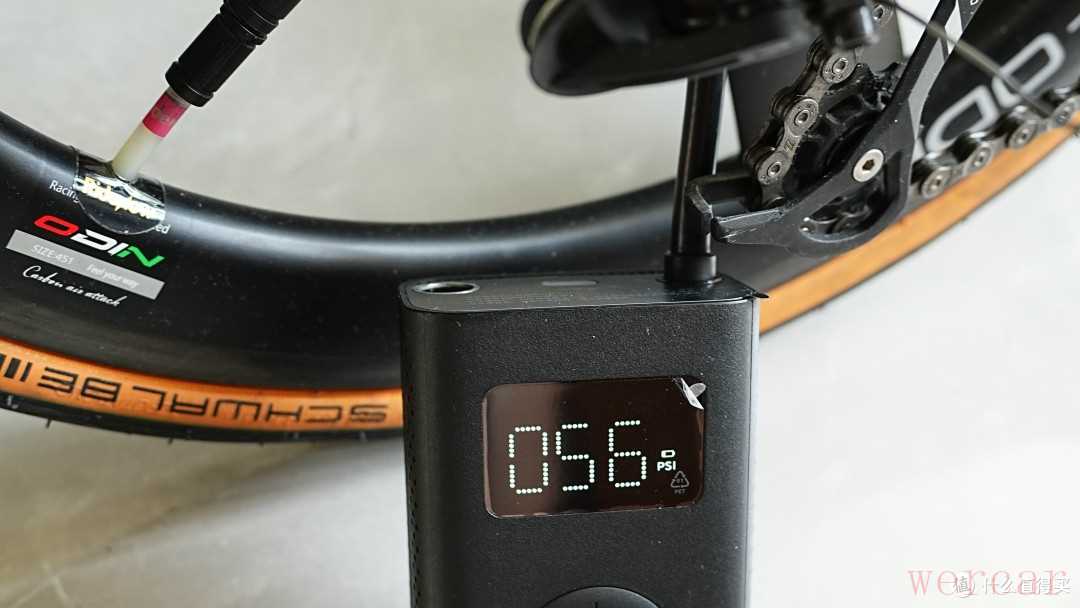 换了超轻内胎,胎压得在100psi,每次出门前都得补气,普通打气筒看不到胎压,又配了个小米充气泵,倒是也方便。