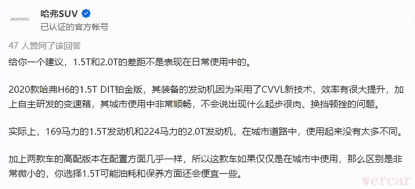 在第三代哈弗H6的2.0T上市那天,有一个哥们问我。因为没有试驾过2.0T的哈弗H6,我也不好,然后就上网找了一下别人的答案。结果在“哈弗SUV”的官方认证账号里找到了上面这个答案。