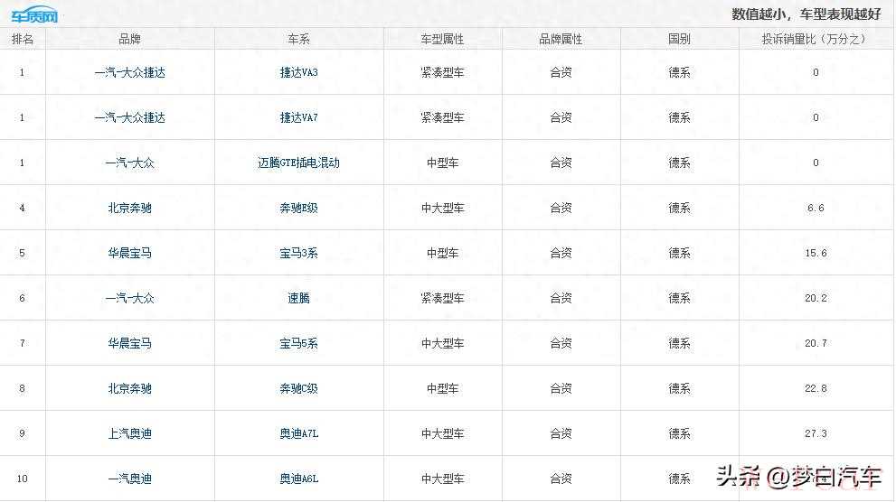 首先,德系车质量榜前三名分别是捷达VA3、捷达VA7和迈腾GTE,捷达VA3夺得冠军,还是挺令人认可的,毕竟作为“老捷达”的延续车型,它的品质表现一般,但品控表现却一直被认可。奔驰E级、宝马3系和大众迈腾也是入榜前六,奔驰E级的投诉销量比低于万分之10,宝马3系和大众速腾分列第五和第六位,投诉销量比都在25以内。此外,宝马5系、奔驰C级、奥迪A7L和奥迪A6L等中高端德系轿车,整体质量表现也都入榜前十名。