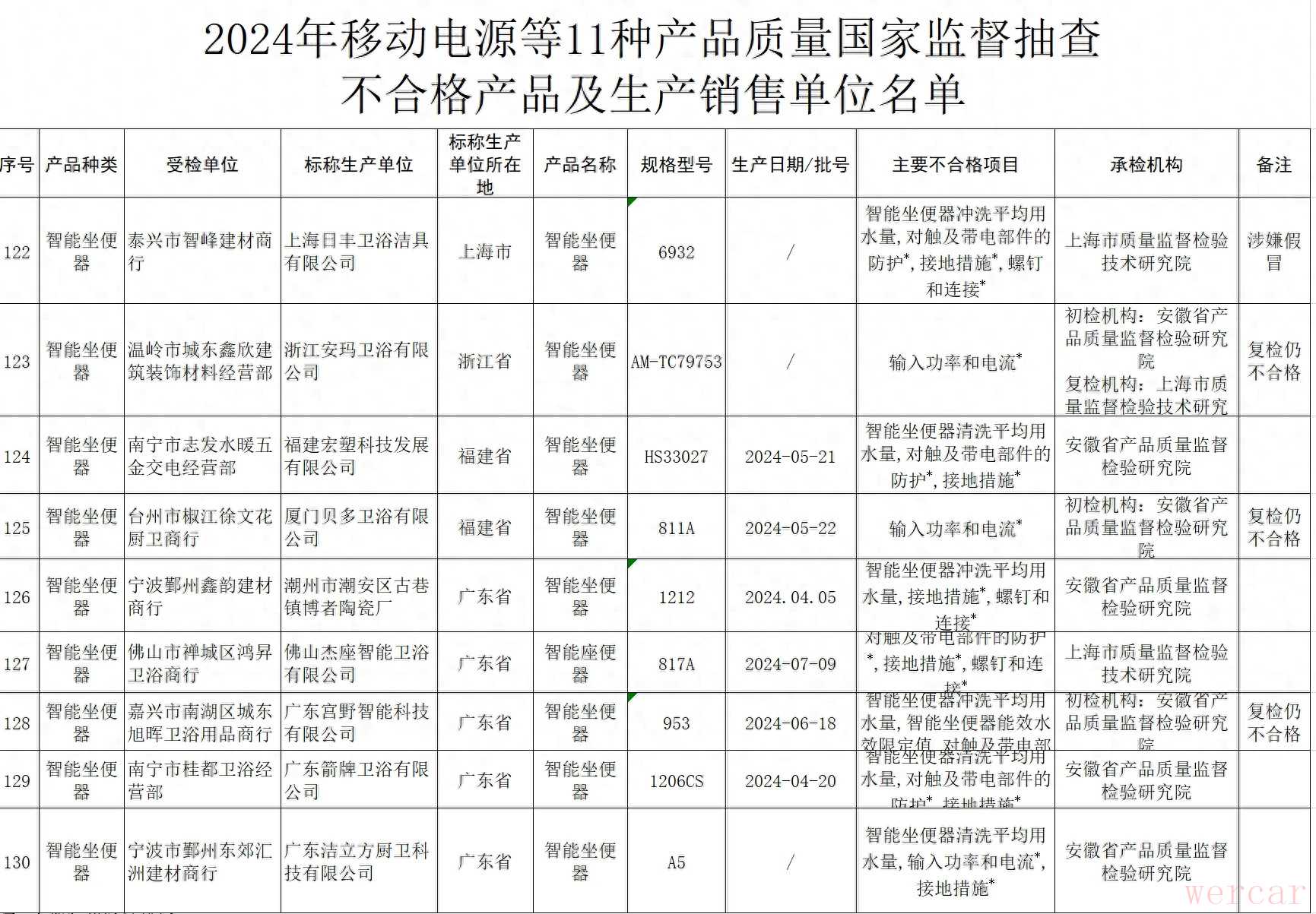 不合格名单显示,标称上海日丰卫浴洁具有限公司生产的智能坐便器(规格型号6932)冲洗平均用水量、对触及带电部件的防护、接地措施、螺钉和连接等项目不合格,且涉嫌假冒;标称浙江安玛卫浴有限公司生产的智能坐便器(规格型号AM-TC79753)输入功率和电流不合格,复检仍不合格;标称厦门贝多卫浴有限公司生产的智能坐便器(规格型号811A;生产日期/批号2024-05-22)输入功率和电流不合格,复检仍不合格。