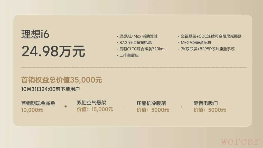 这两天最火的车应该就是理想 i6 了,在试驾的时候,脖子哥有想过这台车应该会比 L6 Max 的 27.98 万元便宜。但真没想到它直接来了个首销期 23.98 万元,还送空悬、电吸门和冰箱。从价格上,理想这次是真拼了。