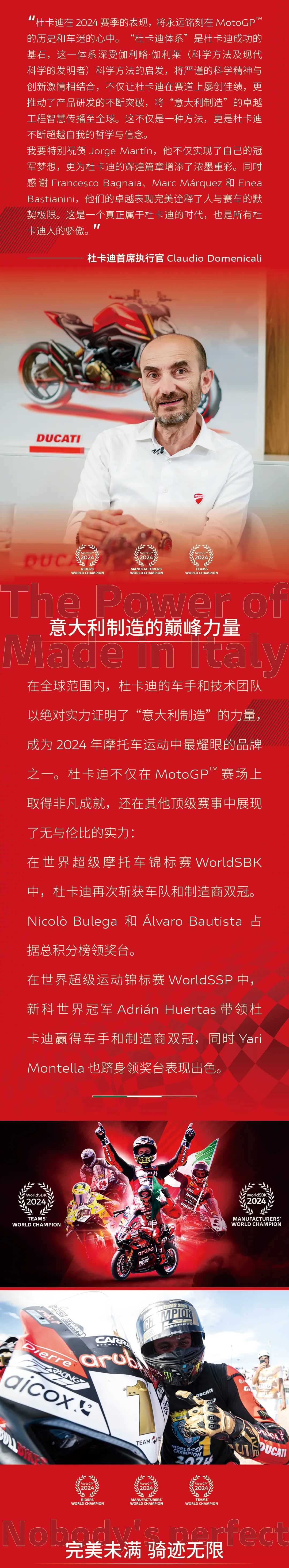 1. "多次夺冠":杜卡迪是MotoGP历史上最成功的制造商之一,拥有多个不同类别(125cc, 250cc, MotoGP)的世界冠军头衔。