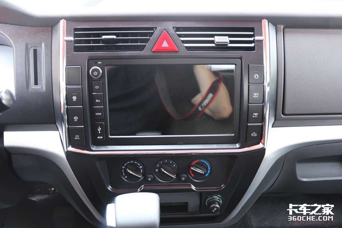 最后再看看中控台设计,是不是很有乘用车中控台的味道?整体采用平面对称设计,还运用了“U”型银色镀铬进行勾勒,凸显其精致感。最引人瞩目的就是中控液晶显示屏,具备多项娱乐功能,还有倒车影像功能,满足卡友们的用车需求。