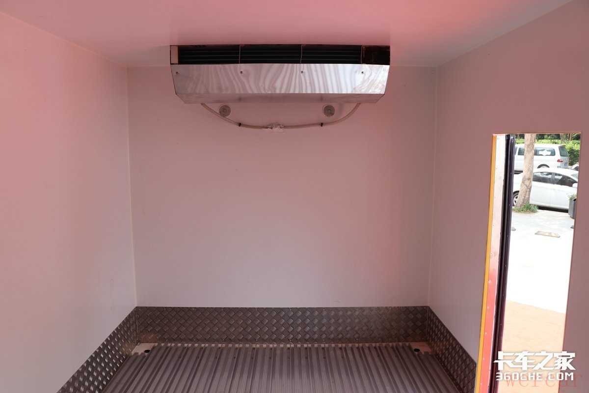 车身尺寸及货箱方面,实拍车型整车尺寸为5995mm×2300mm×3240mm,轴距做到3390mm。该车自带冷机,为独立式设计,既不消耗车辆的动力,也不影响制冷的效率。而货箱尺寸为4170mm×2250mm×2190mm,其内部容积达到21方,整车自重在3.8吨左右。