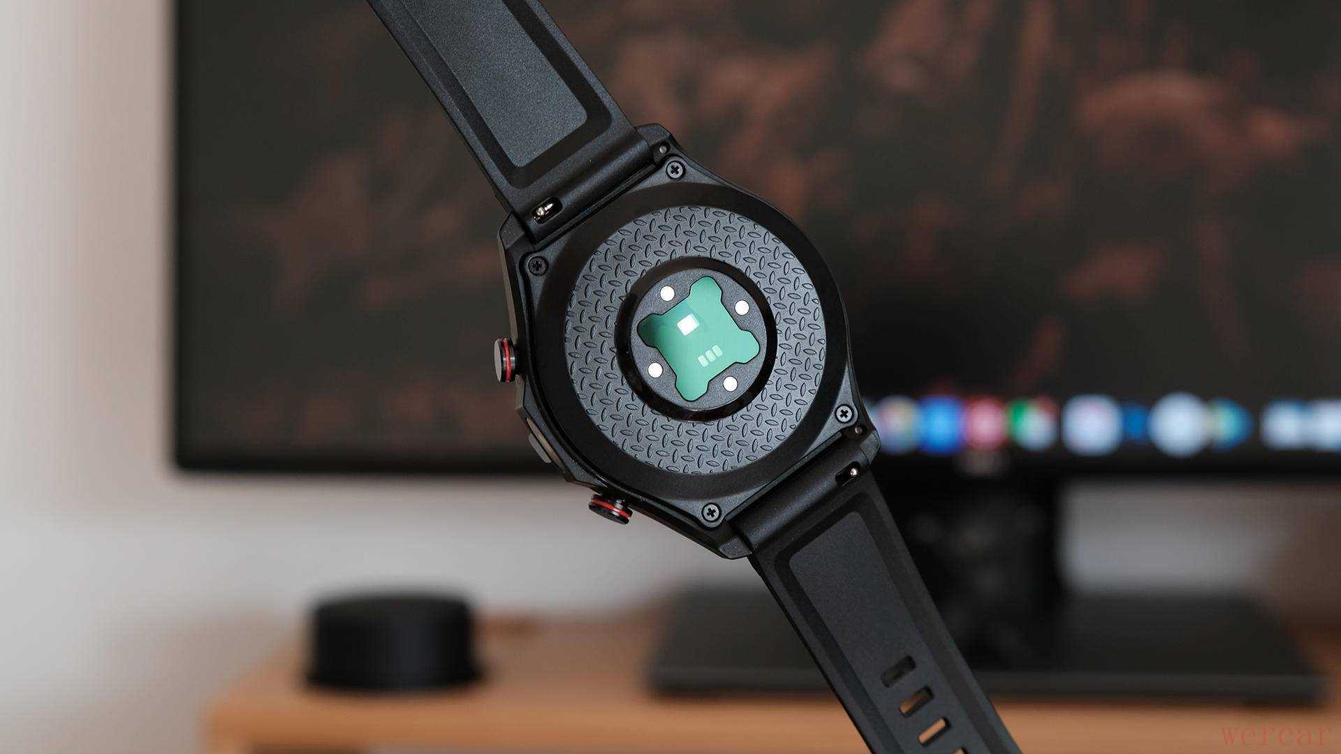 背部光学心率监测感应器,凸出设计为了更好的贴合手腕来测出更加准确的心率数值。周边是一些凹凸的纹理过度,可以简单的排汗,也增加了一定的佩戴舒适度。
