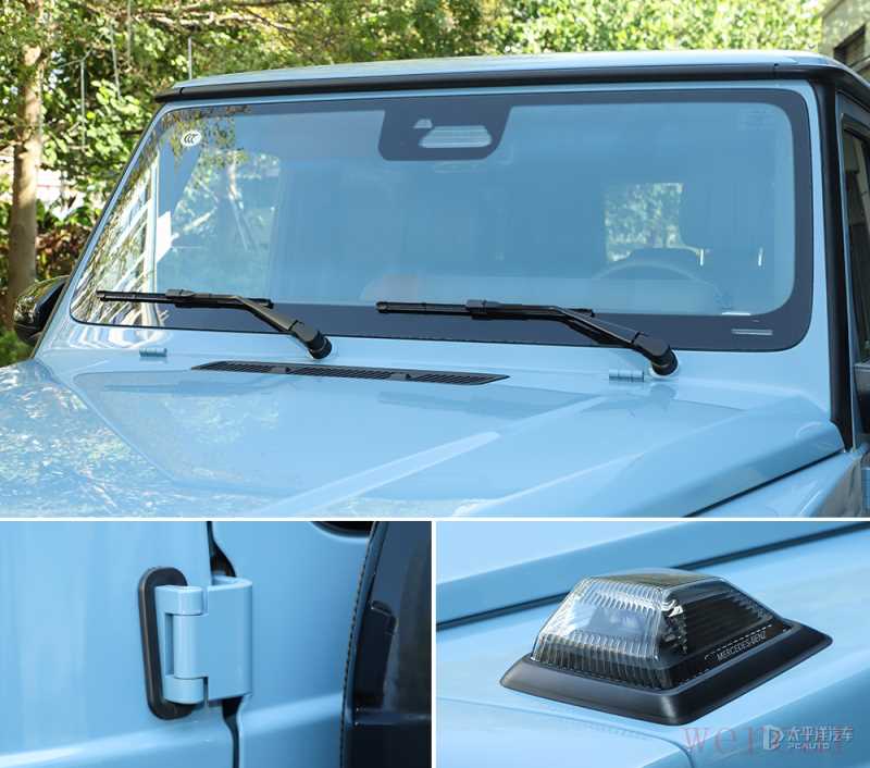 不变的是,新款G500延续了军用车独有的粗犷设计,例如垂直的挡风玻璃、裸露的雨刮器和铰链、隆起的转向灯等,细节极具特色。
