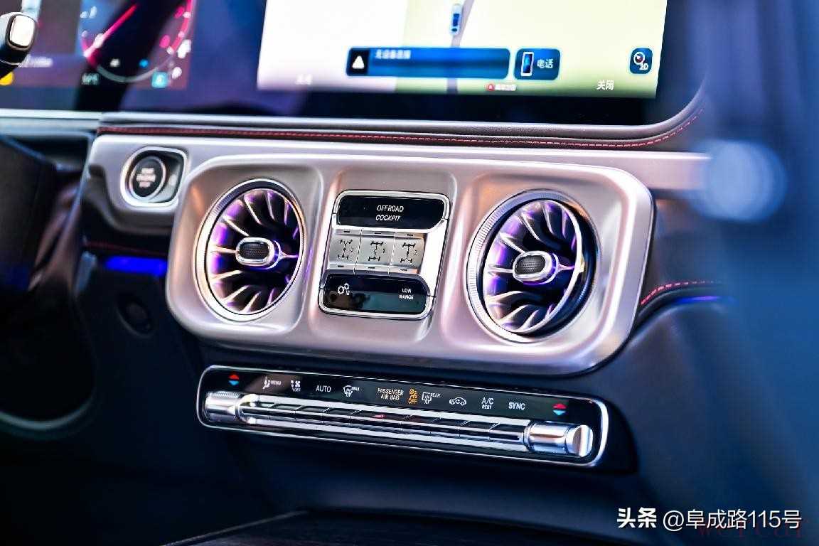 G500在内饰设计方面无论是豪华感还是做工用料都秉承了奔驰的最高水准,用奢华一词来形容也不足为过,中控台采用软性皮革包覆,无论是手感还是视觉效果都堪称一流,三辐式平底方向盘将运动氛围感营造得淋漓尽致,中央控制区域运用了大量的磨砂质感的镀铬装饰,“涡轮扇叶”式空调出风口配合三把差速锁按键,不仅突出中控区域立体感,也彰显了G级越野车的顶级身份。