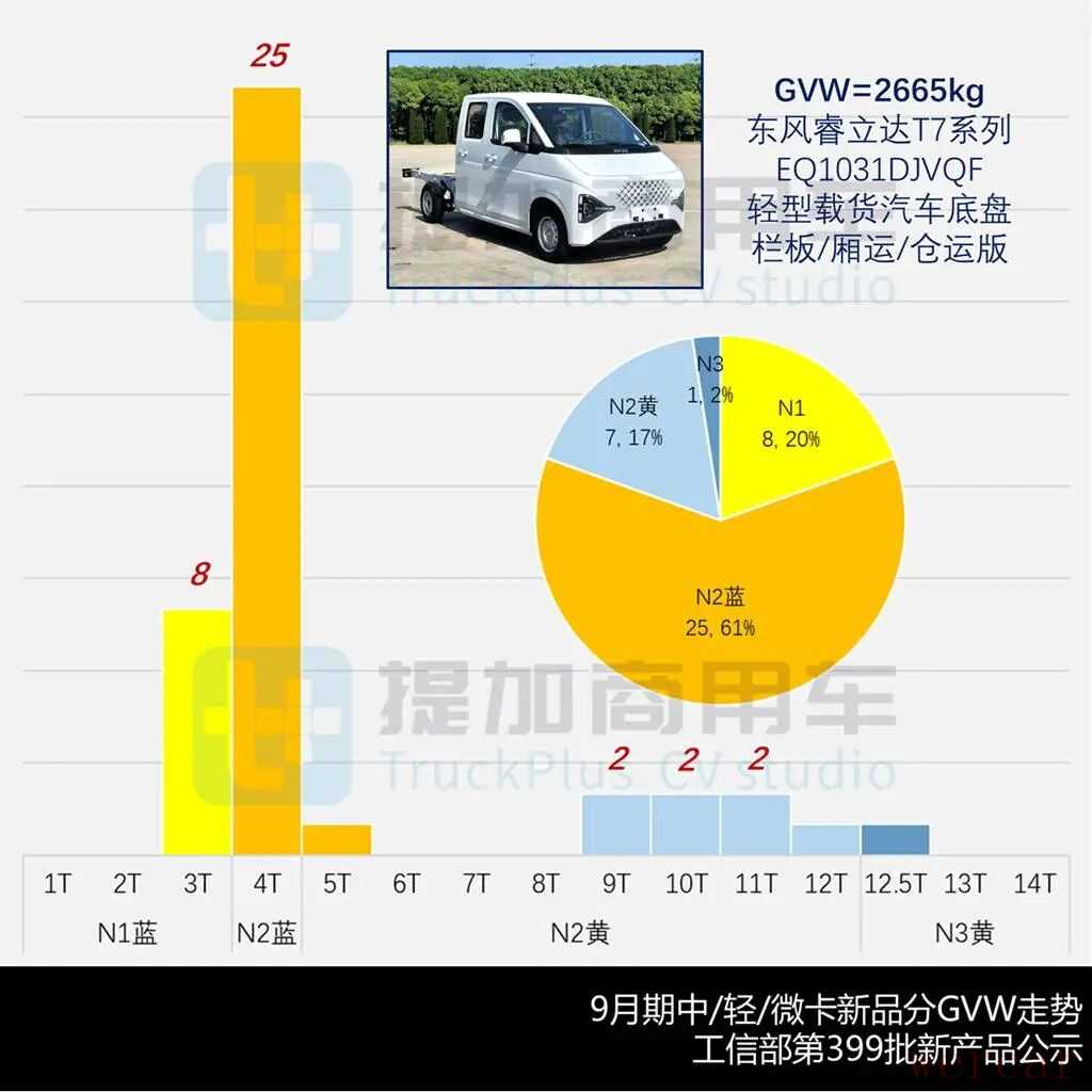 分GVW来看,由于新品数量减少,细分规格也相应缩水,仅有3-5吨和9-12吨两个连续区间,4.5吨规格捍卫头把交椅,其余均只有个位数表现。具体看:- GVW不超3.5吨的N1类新品合计八款、占比19.5%而相对走低。本月期GVW Min=2665kg,即东风股份睿立达T7系列EQ1031DJVQF轻型载货汽车底盘,以及栏板/厢运/仓运版整车,双排座驾驶室,匹配东安1.6L、122马力汽油机,以厢运版为例,形成整车后全长5635mm、箱长2450mm,容积6.8立方米、额载745kg,载质量利用系数0.67,油耗7.6L/100km。作为城配个体的创富车型,东风睿立达T7系列以3万元级别的经济实用性博得不少关注,希望能在燃油微卡/小卡市场“立新功”。