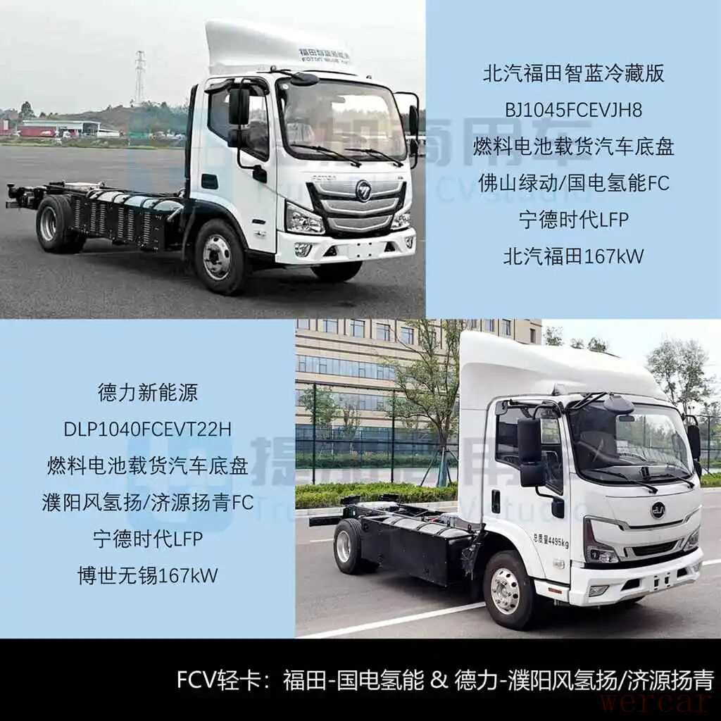 今年前三季度的FCV中轻型底盘新品合计11款,并有7个月期实现申报,虽然无法与2022-2023年的繁荣相比,但较去年同期的6款则是量级突破,亦可知氢能产品仍在探索中。本月期的两款FCV新品均为蓝牌轻卡,具体看:- 北汽福田申报了智蓝系列BJ1045FCEVJH8燃料电池载货汽车底盘,以及冷藏版整车。该新品准乘3人,轴距3360mm,前3片、后8+6片板簧悬挂,搭载佛山绿动/国电投氢能80kW燃料电池+宁德时代LFP动力电池,北汽福田167kW驱动系统(额定75kW、峰值410Nm),形成整车后箱长4050mm、额载435kg。佛山绿动氢能科技有限公司成立于2022年4月,位于佛山市南海国家生态工业园银海大道,是国氢科技的全资子公司,8月期首次为商用车行业配套,与重汽豪沃悍将ZZ1047G3415Z145FCEV开展合作。
