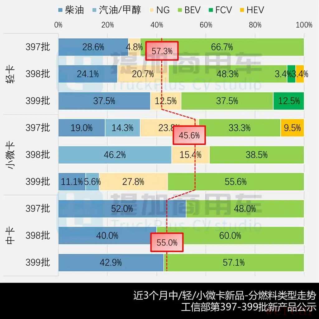 对近三个月内14吨以下中、轻和小微卡新品做燃料类型的动态跟踪,主要特征为:柴油新品持续回暖,新能源主要靠BEV支撑、HEV热度消失。具体看:- 中卡类近三月燃料格局基本企稳,柴油与BEV两种动力大致相当,后者表现稍好、NEV渗透率=55.0%。在市场端销量走低之际,行业研发也适当收敛,燃气、HEV和FCV之于中卡仍非必备的常规技术路线。