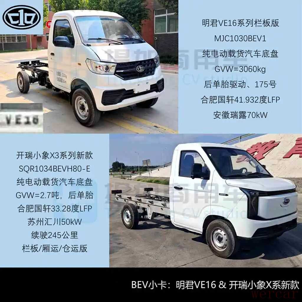 - 四川明君汽车本期申报了VE16系列MJC1030BEV1纯电动载货汽车底盘,以及栏板版整车。该新品基本沿用东风小霸王W08系列同款产品资源,GVW=3060kg,车宽1650mm、准乘2人,轴距3090mm,前6片、后7片板簧悬挂,后单胎驱动、175号轮胎,搭载合肥国轩41.932度LFP动力电池、车架内侧底置方案,安徽瑞露70kW驱动系统,形成整车后栏板箱长3.1米、额载1390kg。作为西南地区的车企,明君汽车有限公司此前通过收购长春一汽轻型车厂获得整车类第133号目录的整车资质,并将其更名为长春一汽华凯汽车有限公司,目前仍利用其经典的“1+CQ”图形商标(一汽长轻)出现。
