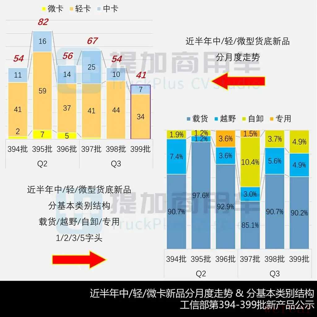 今年9月期工信部第399批公示,N类中/轻/微型货底新品来到全年新低水平,合计仅有41款,环、同比下降24.1%和18.0%,轻卡和中卡类新品数量双双“触底”,整体之低迷在近年也不多见。不过从产品基本类别结构看,本批三大类新品环比基本企稳,可知行业研发属于整体共进退而无须担心。具体看:- 1字头载货类合计37款、份额90.2%,其中轻卡与中卡比例维持5:1格局,而蓝牌轻卡和小卡比例约为1:1,后者恢复强势表现且势头更好,并出现一些行业级新品。