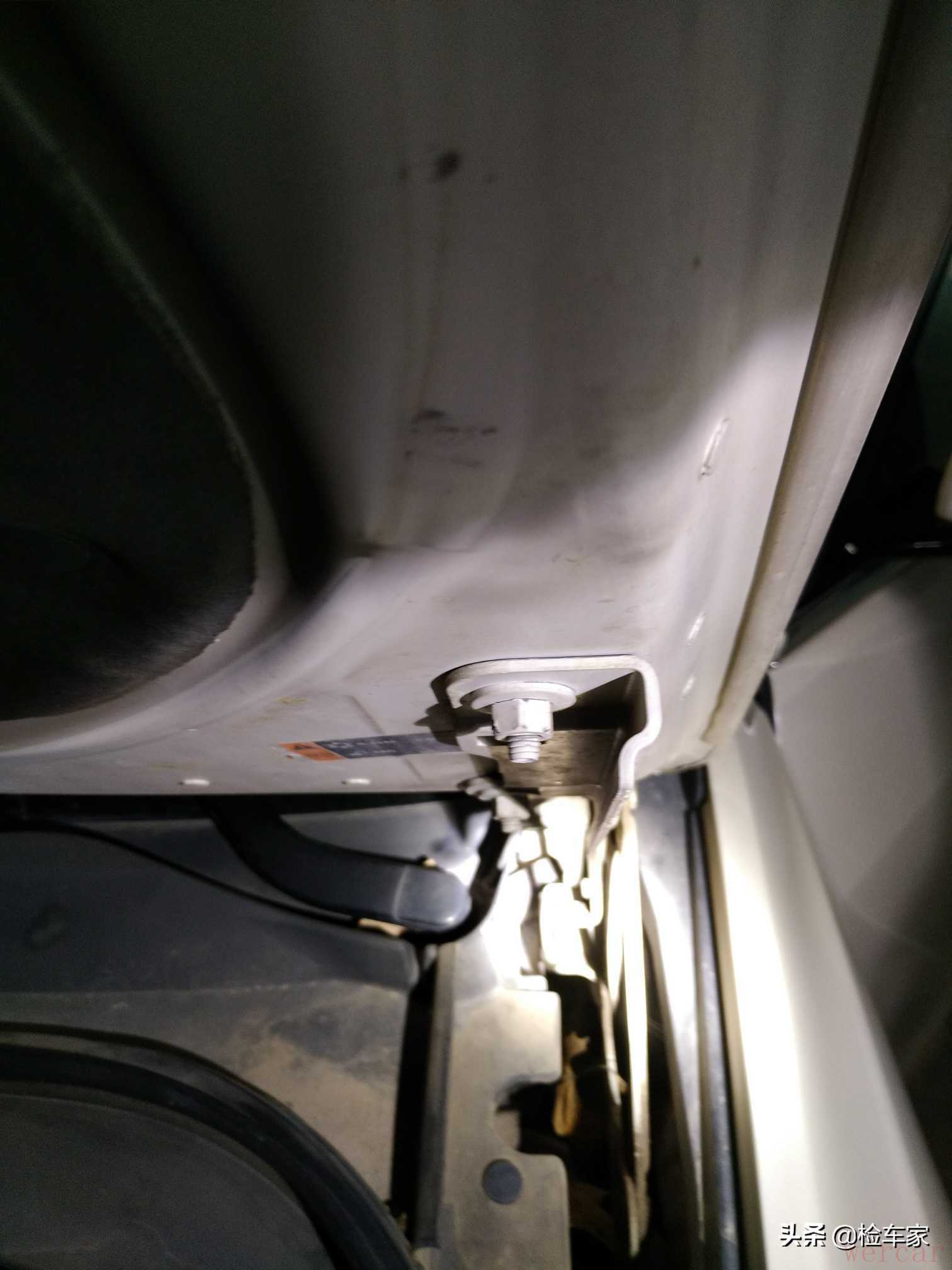 首先我检查了后防撞钢梁的固定螺丝,发现没有拧动拆卸的痕迹,结合漆面检测可以进一步排除车子后部的事故嫌疑。