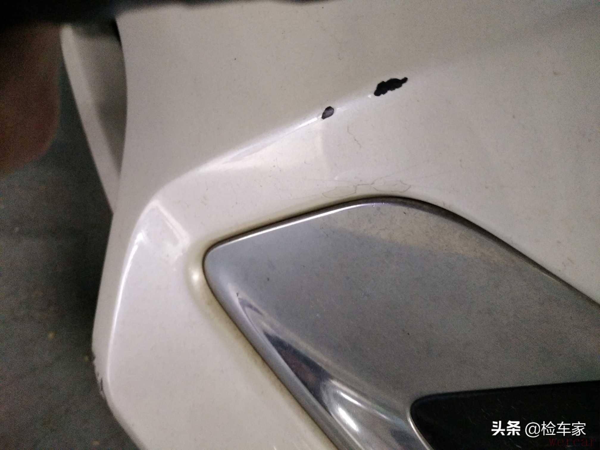 检测还是一如既往从外到内进行,首先围着车子转一圈大致对车辆外观做一个了解,看看哪些部位有瑕疵。发现全车存在多处磕碰掉漆,不过看起来不严重,暂时可以继续使用。