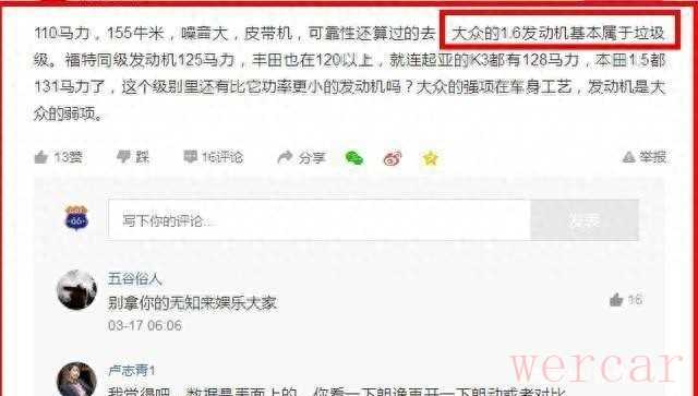 大众的1.6的排量,虽然说动力没有那么的充沛,但是应付家用足够搭配,在朗逸,宝来,捷达等等这些车型上,真正开过的车主都知道1.6的排量平时家用是没有问题的,像下图有一个网友评论了,说大众的1.6的发动机是个垃圾,而且只从马力值上来看,这是很幼稚的言论。
