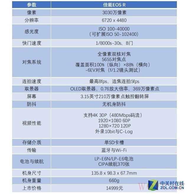 佳能EOS R机身采用了3030万像素,搭载了DIGIC 8处理器,对焦系统采用了个全像素双核对焦系统,覆盖面积达到100%,机身支持4K 30P视频,可以通过HDMI输出10bit的4:2:2视频并且支持C-Log曲线。下面我们就先来看一下佳能EOS R的相关参数信息。