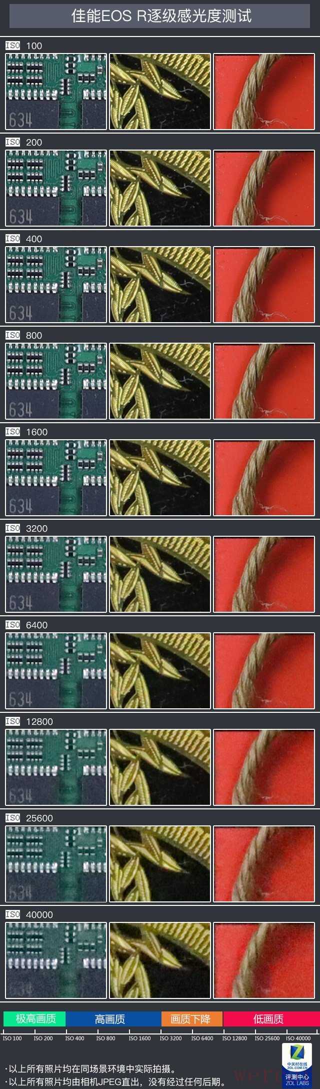 下面我们看一下佳能EOS R的感光度测试。由于目前尚不能解压佳能EOS R的RAW文件,因此我们使用JPG文件作为测试基础。等到Adobe更新软件,我们将第一时间为您带来RAW文件感光度测试、宽容度测试以及RAW文件功能测试。本次测试时我们使用JPG拍摄,机身降噪为标准。