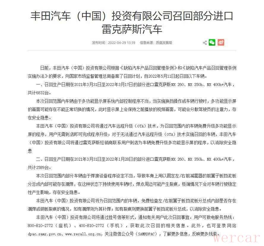 雷克萨斯的频繁召回也让消费者对其质量产生了较大的疑问。2022年5月11日起召回以下车辆。2021年3月31日至2022年3月17日生产的部分进口雷克萨斯NX 260、NX 350h、NX 400h+汽车,共计6832台。召回原因是,由于多功能显示屏系统内部控制程序不当,当实施换挡操作或车辆行驶时,多功能显示屏的画面可能存在不能正常切换的情况,此时显示屏上会保持之前播放的视频画面,可能会分散驾驶员的注意力,存在安全隐患。至于解决办法,很简单远程升级技术。除此之外,还召回2021年3月31日至2022年1月28日生产的部分进口雷克萨斯NX 260、NX 350h、NX 400h+汽车,共计2589台。原因是部分车辆由于焊接设备程序设定不当,导致车身上用以固定左/右前减震器的前翼子板挡泥板分总成内部可能存在漏焊,在这种状态下持续使用车辆时,焊点周边可能产生裂痕,极端情况下会对车辆行驶稳定性产生影响,存在安全隐患。