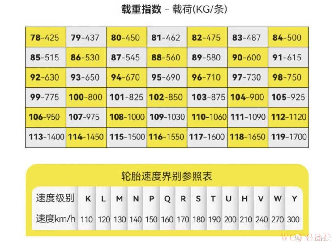 下面这个就是轮胎载重参数和轮胎速度参数对照表