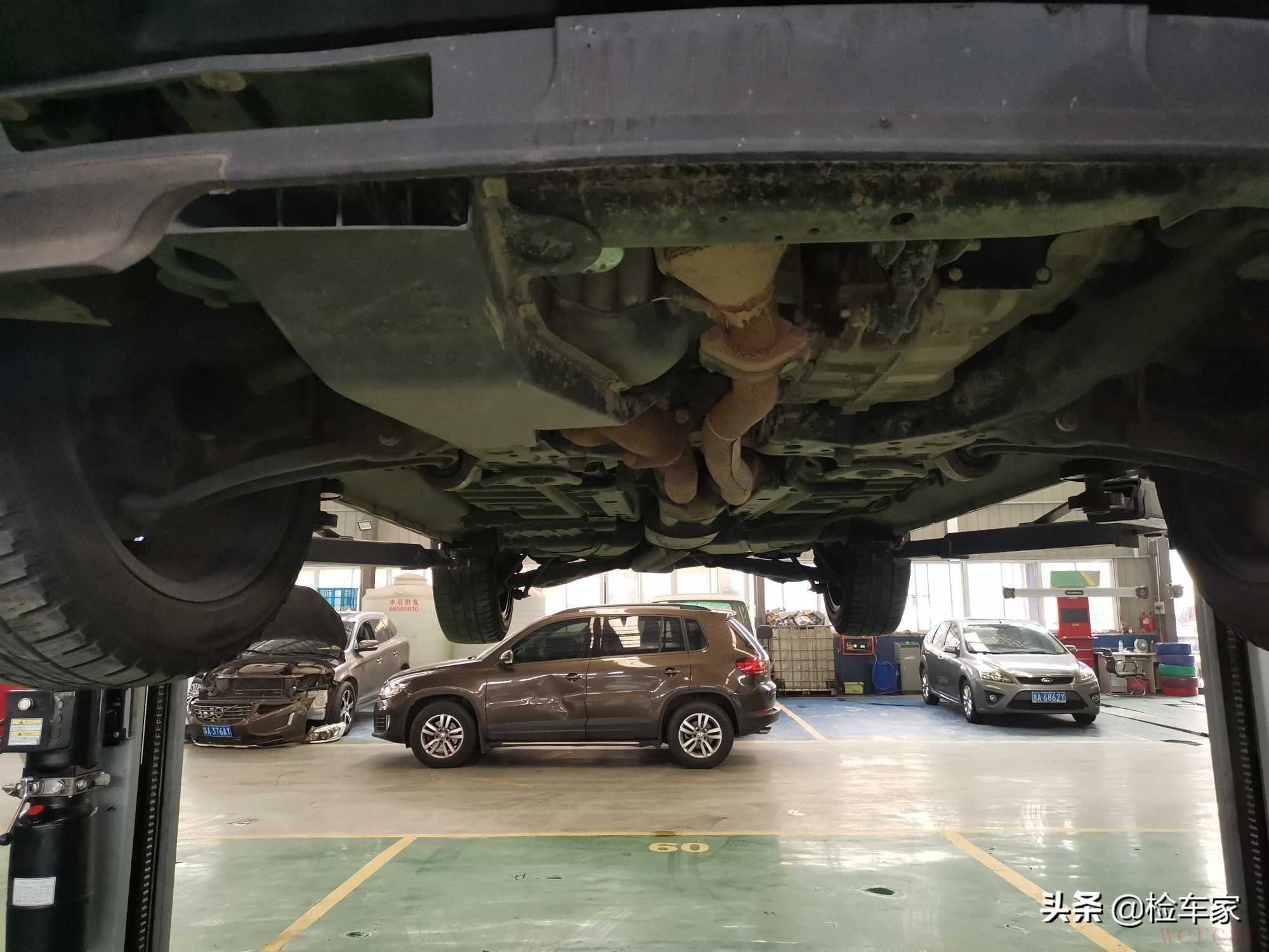 路试结束就是咱们的底盘检测了,通过举升机将车辆升起后,大致看去底盘没有明显的托底以及漏油痕迹,具体情况怎么样还得细细的检测一番。