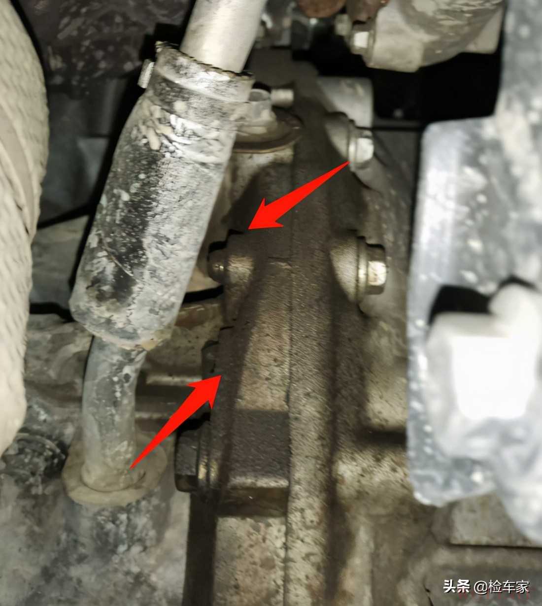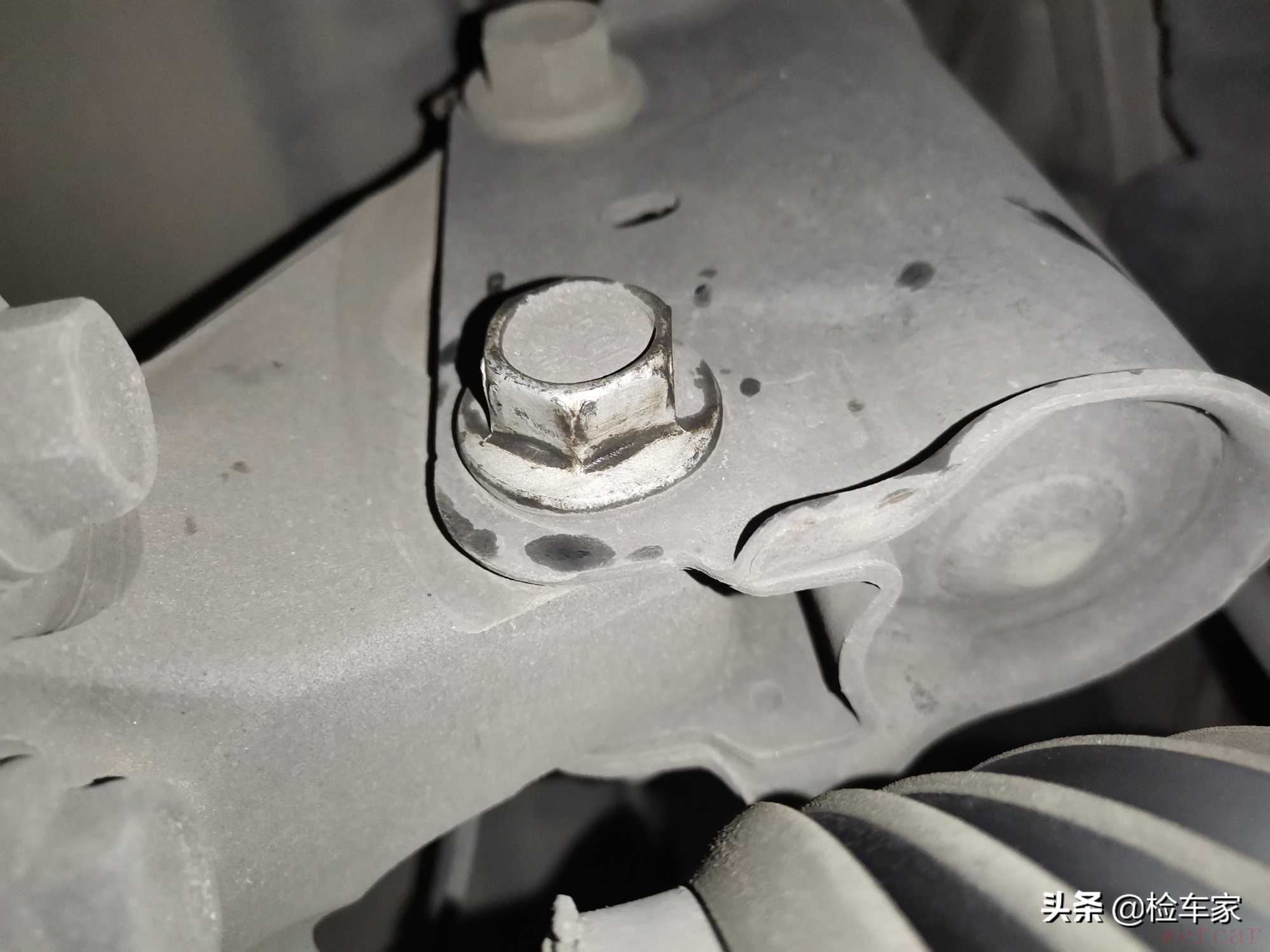 发动机和变速箱经过检测没有拆卸维修的情况,但是变速箱这个位置有渗油,不过春哥在现场分析应该是曲后油封渗油造成的,这个问题不大就是有点费时间,如果心里有介意的话可以到4S店做保养时就顺带搞一下,当然也可以开段时间再去处理。