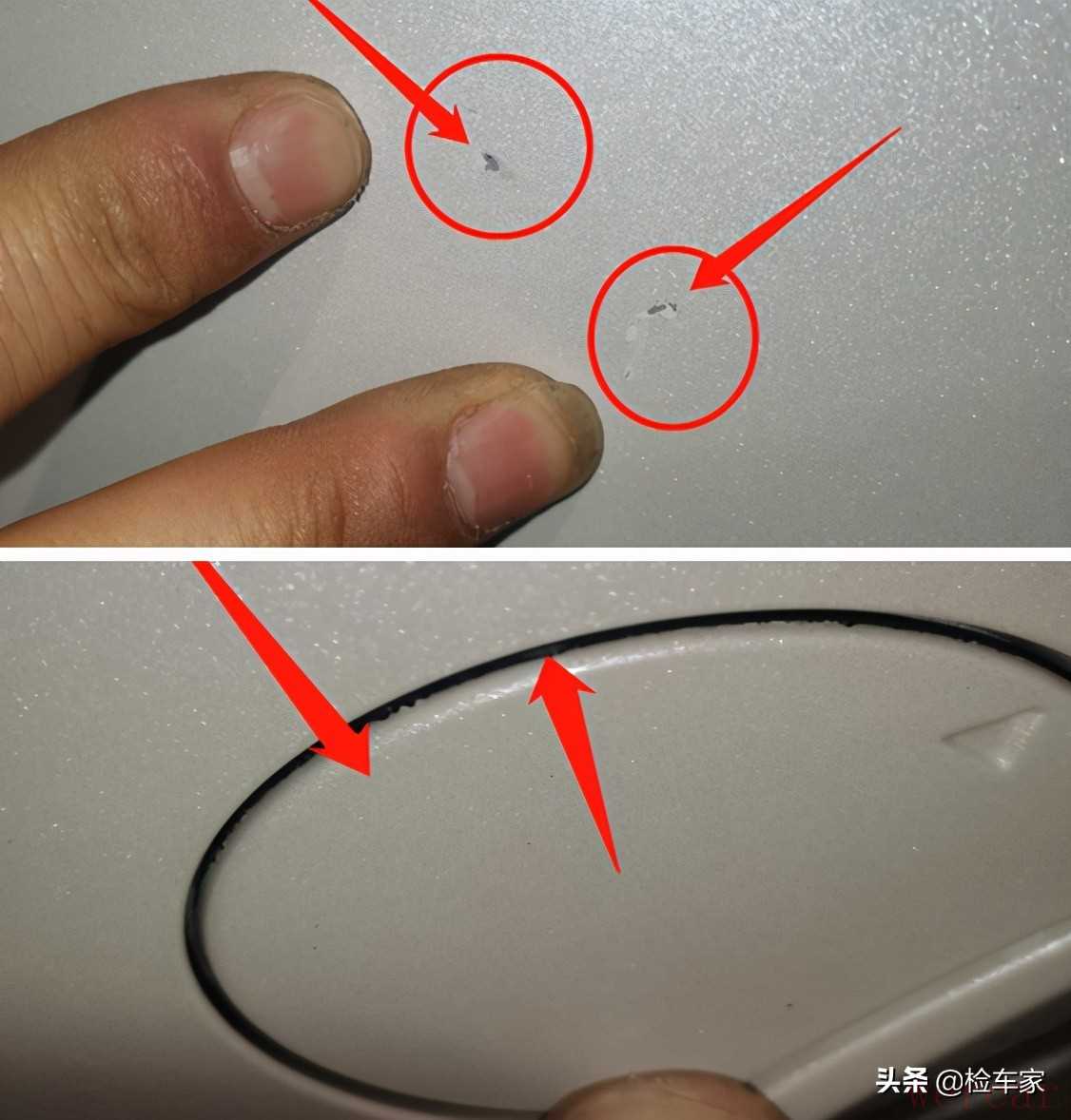 首先围绕车辆一圈,发现多处细小的划伤,不过影响不大,可以继续使用,如果确实看不下去可以去4S店简单处理一下也不麻烦,不过前保险杠有修复的情况就得小心了,先不急着下判断,咱们后面检测看看车辆前部会有啥情况。这里春哥我给大家分享一个小技巧,怎么来查看小坑?用手电筒或者手机闪光灯从侧面照射漆面,形成不到180度的角度,一下就可以清楚地观察到凹陷划痕还有漆面上的脏点。