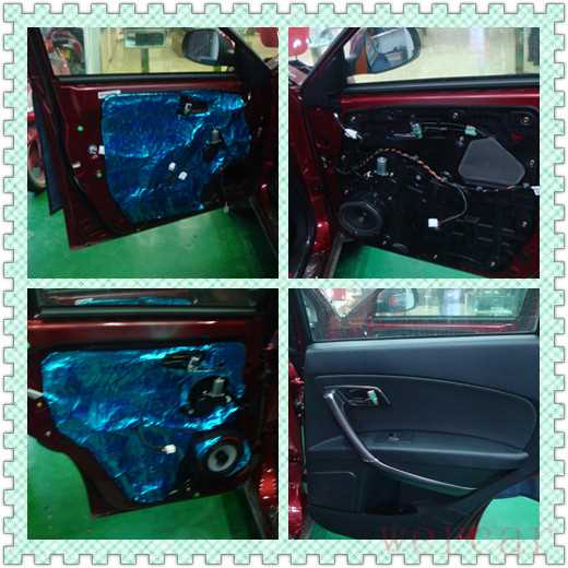 NO4:接下来改装的第一道工序就是门板隔音,很多人喜欢音响可是往往会忽略隔音强大的功能和作用,特别是在汽车音响领域隔音的功能是至关重要的,隔音的改装可以分为多个部位,今天我们介绍的就是能直接影响音响效果的部位门板。门板隔音一共分为两层,里面一层和外面密封层,里面这层能有效的截止铁皮的震动,特别在中低音扬声器工作是基本上所表现的频率范围在300HZ-3.5K这个范围。然而这个范围的频率相当容易引发铁片震动,当然我们紧贴一层阻尼板后共振就会减少很多。里面做完了自然外面也是相当重要的,外面一层能有效的密封门板使门板形成一个密闭的箱体。这样对整个音响系统中的中低频表现起到致命的作用。