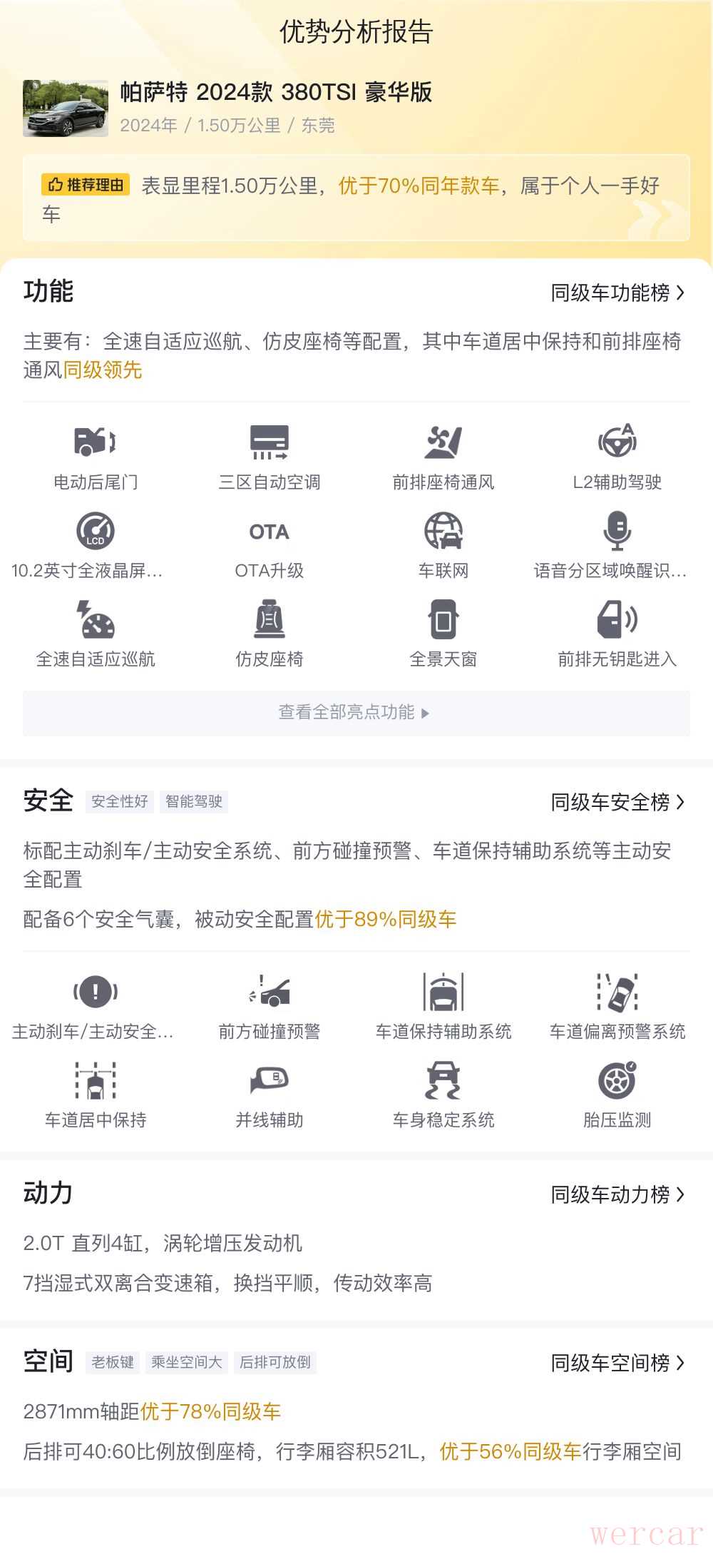 目前它的报价是14.99万,近1年车,也算是一个正常的价格,同时帕萨特 2024款 380TSI 豪华版的保值率也高,同级车平均保值率是51.77%,它的则是54.90%。