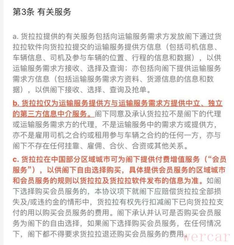 新京报记者查阅得知,当司机在注册货拉拉平台时,需签署相关软件使用信息服务协议(下称《协议》),《协议》提到,货拉拉仅为运输服务提供方与运输服务需求方提供中立、独立的第三方信息中介服务,“阁下同意及承认货拉拉不是阁下的代理或运输服务需求方的代理,不是运输服务中的需求方或提供方,亦不是雇用司机之合约或租用参与车辆之合约的任何一方,亦与阁下不存在任何挂靠、雇佣、合伙、合资或其他关系”。