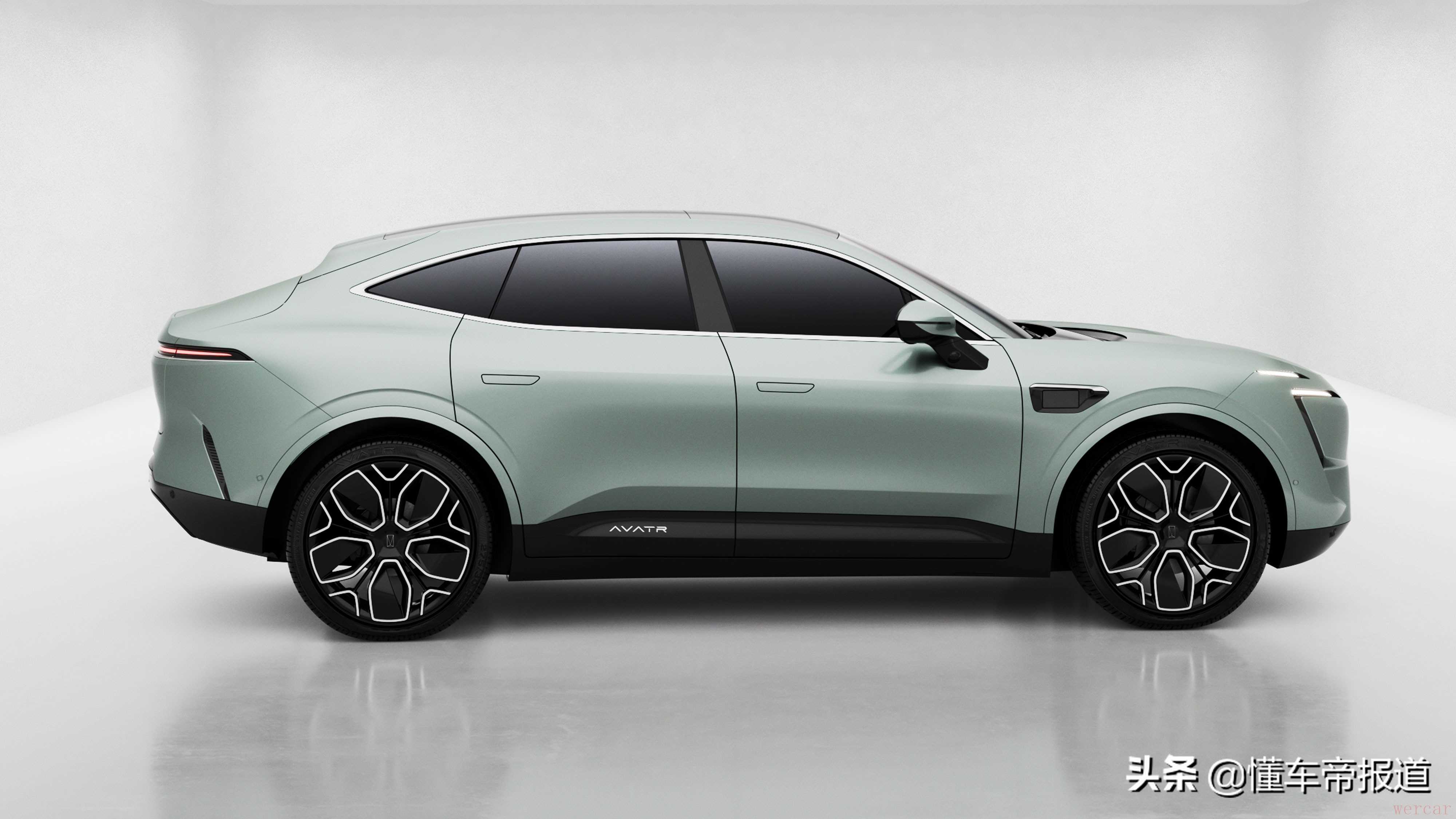 在车身侧面,阿维塔11采用了轿跑式SUV造型,配备大尺寸花瓣状轮辋及带品牌标识的黑色防刮侧裙,车辆还配备电动车型上常见的隐藏式门把手。