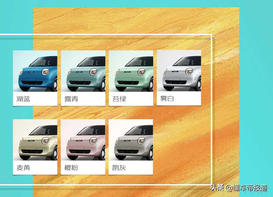 该车将推出7款外观车色,分别为雾白、苔绿、湖蓝、鹊灰、露青、麦黄、樱粉