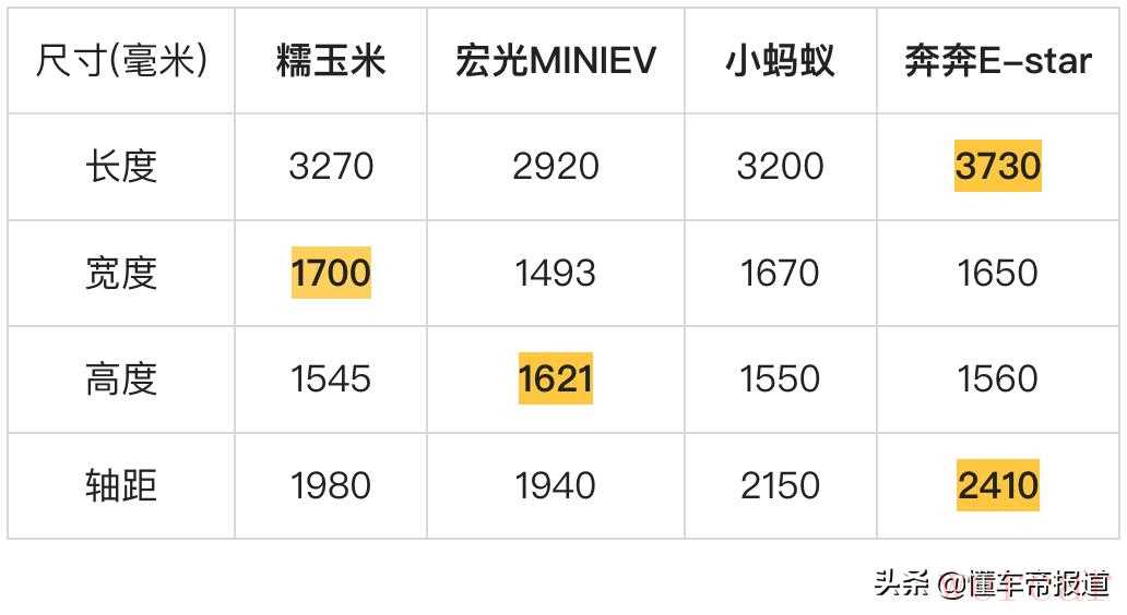 与呆萌的造型相符,长安“糯玉米”定位微型纯电动代步车,尺寸方面,该车长宽高分别为3270/1700/1545毫米,轴距为1980毫米,比长安新能源奔奔E-star尺寸小一些,在同级车型市场上,它比五菱宏光MINIEV、奇瑞新能源小蚂蚁都要更长、更宽,轴距比小蚂蚁短170毫米。