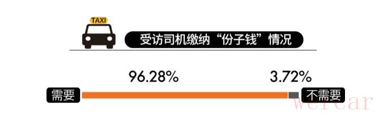 有接近半数的受访司机表示“份子钱”提高也是导致收入未增加的原因之一。调查中,有超过九成出租车司机表示仍需要缴纳“份子钱”,而且数额颇高。通过对受访司机填写的“份子钱”缴纳金额进行统计,结果显示受访司机每日每班次缴纳的“份子钱”平均金额约为192元,相当于每位司机每月需要向出租车企业缴纳接近6000元的费用。但在本次调查中,有超过四成的出租车司机收入不到5000元。换言之,相当大部分的司机每个月有过半数的营收需要作为“份子钱”上交,最终实际收入少于“份子钱”。