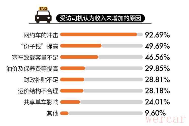 但值得注意的是,本次调查中有58.36%的受访司机认为过去一年来收入不增反减,还有三成受访司机认为收入没有变化。而在进一步追问原因时,有超过九成司机觉得是网约车的冲击所致。近年来,网约车的出现有效填补了出租车的供给不足,但这也意味着网约车在一定程度上抢占了出租车的市场。这可能令不少出租车司机认为网约车抢了本应属于自己的客人,从而产生收入下降的感觉。但不论如何,这一数据依然反映出目前过半数的出租车司机对收入不满意。