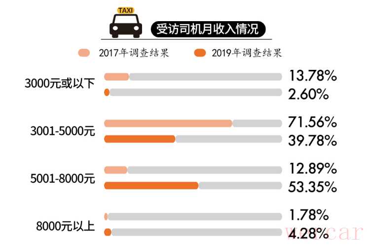 在问及收入情况时,有53.35%的受访司机表示目前每月收入在5001-8000元之间,39.78%的司机收入在3001-5000元之间。而南都民调中心在2017年发起的同类调查结果显示,当时仅12.89%的受访司机每月收入在5001-8000元之间,71.56%的司机收入在3001-5000元之间。通过两次调查结果的比较,可以看出过去两年内出租车司机群体的收入确实有所提升。