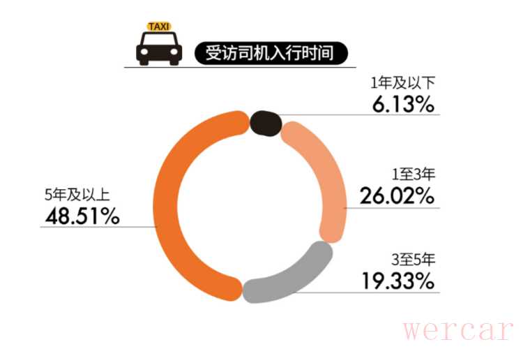 调查结果显示,入行5年以上的司机占48.51%,入行3至5年的仅占19.33%,入行3年以下的则有32.15%。由此可以发现,2014-2016年期间入行的出租车司机相对较少,但近3年入行人数有所回升,这一趋势正好与国内网约车的发展趋势相契合。