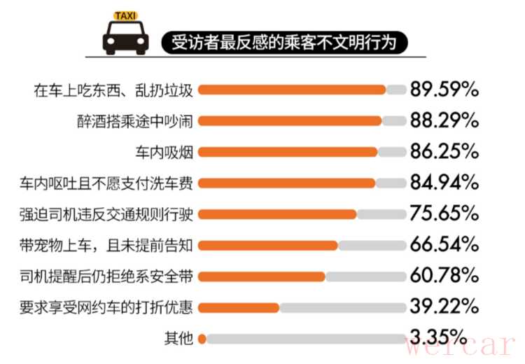 在乘客对出租车司机的违规行为表达不满的同时,司机对乘客的不文明行为也有一肚子苦水。调查中,受访司机反映最多的不文明行为是车上饮食/乱扔垃圾、醉酒搭乘途中吵闹和车内吸烟。