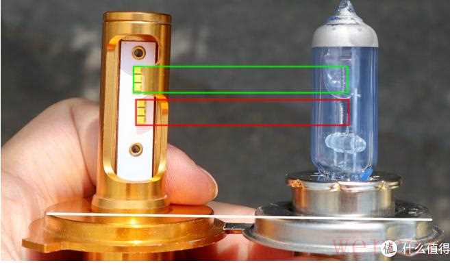 我们装上卡座,仔细对比两个灯泡。这个时候,我对于LED灯将来在聚光方面的表现还是非常期待而且有信心的。首先,这个LED发光灯珠确实很小,眼看着就和普通卤素灯泡的灯丝几乎一样,再看高度,在安装平面几乎一致的情况下(白线),近光灯丝(绿框)远光灯丝(红框)的高度和长度都及其接近。近到我很难分辨出差距。我想从这个角度出发,光型方面应该不差的。